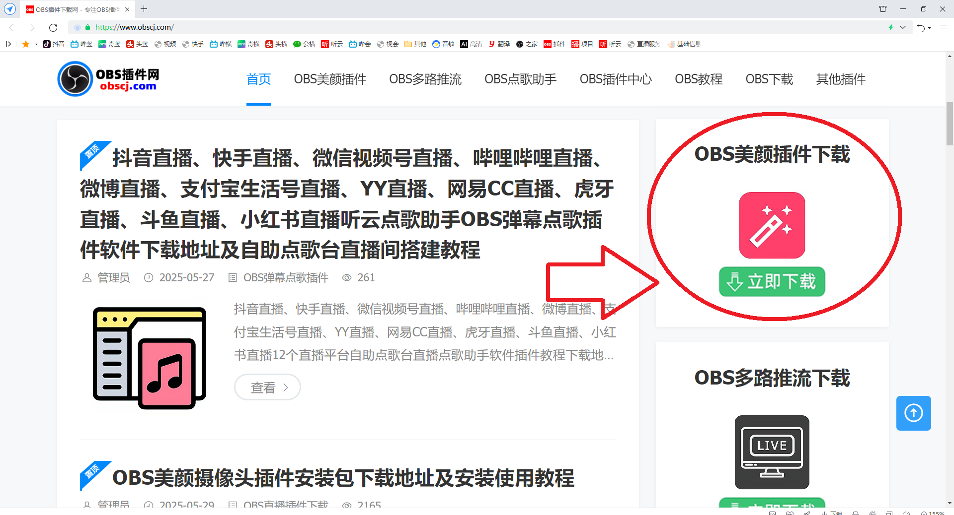 打开OBS插件网 www.obscj.com 打开之后,找下图红色圈圈的位置,点击绿色按钮立即下载,下载完成后安装完成即可。